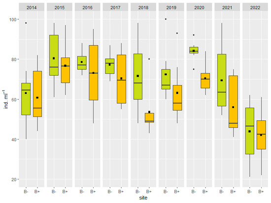 Ciliate abundance was markedly varied at the study sites. The highest abundance was recorded at site B− in 2015 (92 ind. mL−1). Abundance of ciliates was lowest (55 ind. mL−1) in 2022. In the B+ habitat, the highest ciliate abundance was noted in 2016 (87 ind. mL−1) and the lowest in 2022 (35 ind. mL−1) (Figure 2). At site B− as well as at the site where restoration measures were not carried out, the highest ciliate abundance was attained by the following species: Cinetochilum margaritaceum (at B−, a total of 769 ind. ml−1; at B+, 1035 ind. mL−1). The least numerous species at site B− was Spathidium sensu lato (54 ind. mL−1 in total), while at site B+, the least abundant species was Colpoda cucullus (42 ind. mL−1).