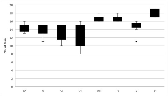 Average seasonal changes in number of taxa of Ciliata in B−, from 2014 to 2022 (No. of taxa—number of taxa, IV–XI: months).