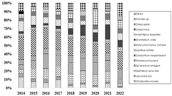 The dominance structure was markedly varied in the years 2014–2022. At site B−, in 2014 and 2015, the dominant taxa were Strombidium viride (26%, 27%) and Cinetochilum margaritaceum (12%, 17%). In the following year, in addition to Strombidium viride (23%), Aspidisca costata was a dominant taxon (16%). In 2017–2020, there were three dominant taxa: Strombidium viride (20%, 17%, 20%, 12%), Cinetochilum margaritaceum (12%, 13%, 15%, 15%), and Aspidisca costata (10%, 11%, 15%, 15%). In 2021, Coleps hirtus (24%) was dominant, and in 2022, Strombidium viride became dominant once again (24%) (Figure 5). At site B+, in 2014 and 2015, the dominant ciliate taxa were Chilodonella uncinata, Amphileptus cleparedei, and Cinetochilum margaritaceum. In 2016 and 2017, Cinetochilum margaritaceum accounted for 22% and 17% of ciliates. In 2018 and 2019, three dominant taxa were identified: Strombidium viride, Cinetochilum margaritaceum, and Spirostomum ambigum. In subsequent years the following taxa were dominant: in 2020, Sphatidium sensu lato, Spirostomu ambigum, and Coleps spetai; in 2021, Strombidium viride; and in 2022, Paramecium bursaria (Figure 6).