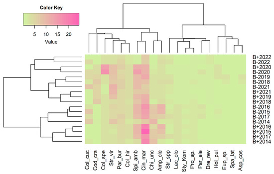 The similarity analysis indicated the occurrence of seasonal taxonomic differences between the study sites (B− and B+). The highest similarity was noted in the area colonized by birch, especially in the years 2014–2016, while considerable differences in species were observed at the site where birch was removed, especially in 2018–2022 (Figure 7).