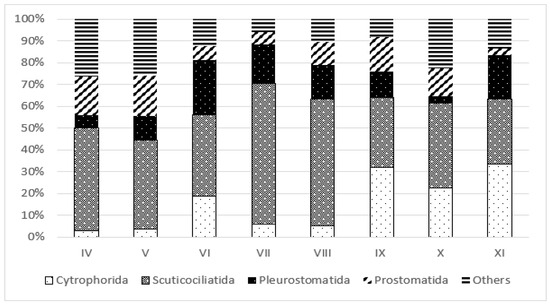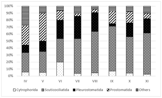 Seasonal changes in percentage of contribution of dominant orders of Ciliata in B+ (IV–XI: months).