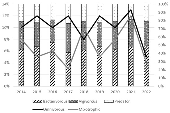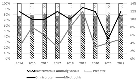 Bacterivorous ciliates accounted for the largest proportion of ciliates in the B− habitat, with slightly fewer algivorous and predatory ciliates. Omnivorous and mixotrophic ciliates had a small share (Figure 10). Similar results were observed in the B+ habitat. Bacterivorous ciliates accounted for nearly 50% of identified organisms, while 15–20% were algivorous and predatory ciliates, and 12% were omnivorous and mixotrophic (Figure 11).