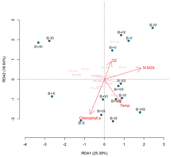 Redundancy analysis (RDA) biplot for habitats, showing environmental variables and months of research. Arrows indicate significant parameters in the Monte Carlo permutation test at p < 0.05. B−: habitat from which birch was removed, B+: habitat continuously overgrown by birch, IV–XI: months, Temp = water temperature, O2 = dissolved oxygen, Chl-a = chlorophyll a, N-NO3 = nitrate nitrogen.