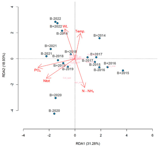 At site B−, the temperature was higher than at site B+. In the vast majority of analyses, the pH was slightly higher in the B− habitat. In addition to the increase in pH, increased values were noted for biogenic substances, conductivity, and oxygen concentration. The concentration of chlorophyll a content was higher at site B− (the highest concentration, 37 mg L−1, was recorded in 2015) (Table 1 and Table 2).
