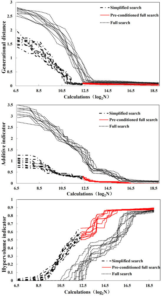 Based on the sensitivity analysis results, a total number of 38 parameters were selected to form a simplification multi-objective optimization problem. By using the NSGA-II method, the full search scenario and the pre-conditioned full search scenario were set to compare the algorithmic efficiency. The results for the three evaluation indicators, including the generational distance, additive indicator, and hypervolume indicator, are shown in Figure 5.