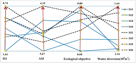 In Figure 6, the horizontal direction denotes four scheduling objectives, the vertical direction represents the values of each objective for different feasible solutions, and the red doted arrows means the target value changed from the bad to the good. S11, S12, S13, and S14 are the feasible solutions obtained using the full search method, and S21, S22, S23, and S24 are the feasible solutions obtained using the pre-conditioned full search method. For the ISI, ASI, and the water diversion objective, the smaller the target value, the better; meanwhile, for the ecological objective, the bigger the target value, the better. From Figure 6, we can see that for each single objective, the optimal solutions obtained by the sensitivity analysis pre-processed were superior to those obtained by the unprocessed method. The solutions obtained by the pre-processed full search method show obvious advantages compared with the unprocessed method.