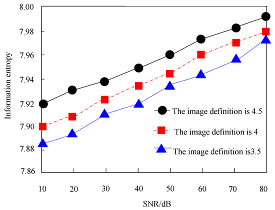 As can be seen from Figure 4, with the increase in signal-to-noise ratio, the information entropy of the debris flow remote sensing image fused by this method gradually increases, especially when the signal-to-noise ratio is 80 dB. When the definition of the debris flow remote sensing image to be fused is 4.5, the information entropy of the fused image exceeds 7.98 (usually, the theoretical value of image information entropy is 8, and the closer it is to the theoretical value, the better the image quality will be). Even if the signal-to-noise ratio is 10 dB, the information entropy of the fused image exceeds 7.88, while the resolution of the high-debris-flow remote sensing image is 3.5. Therefore, after the remote sensing image of debris flow is produced by this method, the information of the original image is well preserved. This can effectively make up for the lack of information in a single image, improve image clarity, and lay the foundation for the subsequent feature extraction of debris flow images.