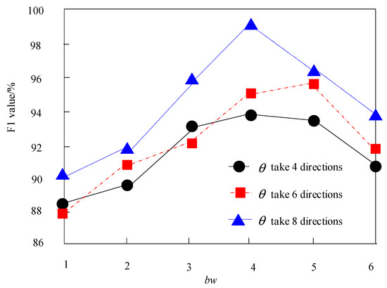 The FI value is an indicator of comprehensive recall and accuracy. The higher the FI value, the better the feature extraction effect will be. It can be seen from Figure 5 that under different conditions, values are different, and the Gabor filter has different effects when extracting different directions of information from debris flow images of mass rainstorm. Under the same condition of , when takes eight directions and directions, the FI value performs best, reaching over 90%, which is better than the extraction effect of taking four directions and six directions, while the extraction effect of on four directions is relatively poor. On the whole, when and takes eight directions and , the Gabor filter proposed in this paper has the best effect on the feature extraction of debris flow images of mass rainstorm in all directions, and it can maintain high accuracy and recall.