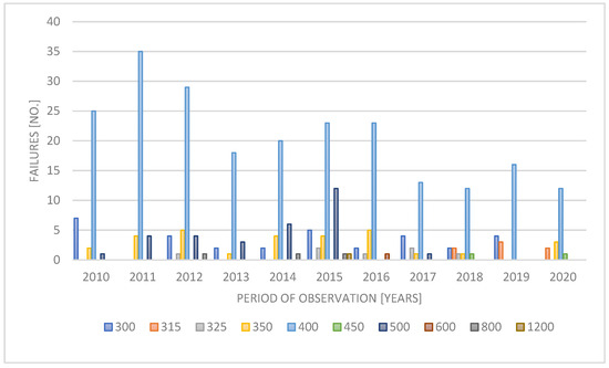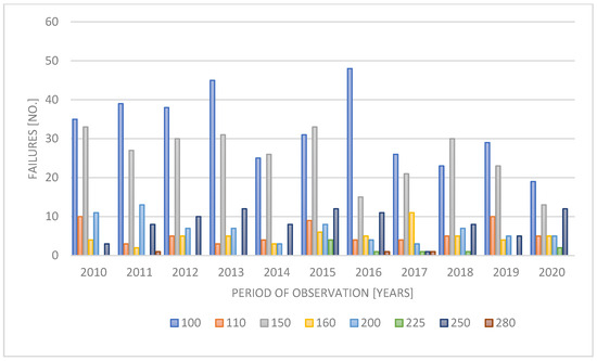- according to Table 2, the value of the P parameter has been assumed at P = 1 because, based on the number of failures recorded in 2020, i.e., <20 failures per year, the failure frequency parameter has been assumed as fi ≤ 0.1 events/year;
