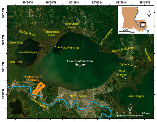 26. Mize, S.V.; Demcheck, D.K. Water quality and phytoplankton communities in Lake Pontchartrain during and after the Bonnet Carré Spillway opening, April to October 2008, in Louisiana, USA. Geo-Mar. Lett. 2009, 29, 431–440. [Google Scholar] [CrossRef]