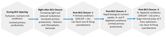 Figure 2. Estuarine biogeochemical dynamics and phytoplankton succession during large inflows of nitrate-rich freshwater. The diagram is based on observations in the Lake Pontchartrain Estuary during the 2008 and 2011 Bonnet Carré Spillway (BCS) openings. BCS closure 1–3 indicates that the system can move from P-limitation to N-limitation in <1 month during warm periods (water temperature ≥ 25 °C). Modified from [22].