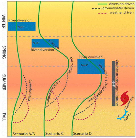 Figure 4. HAB community responses to variability in nutrient input due to climate and anthropogenic forcing. Scenario A/B represents an early winter river-diversion or no-river-diversion year. Scenario C represents an early spring river diversion resulting in an input of excess N and P. Scenario D represents a late spring or early summer river diversion. The green line represents the plankton community’s response to increased N and P from the river diversion and species succession. The dotted gray line represents the plankton response sustained by an additional input of N and P from groundwater discharge and surrounding tributaries. The dotted red line represents a response to the internal input of predominately P through weather-driven resuspension events.