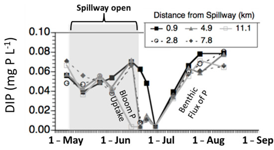 Figure 5. The water column DIP concentrations in the Lake Pontchartrain Estuary are first elevated at several stations due to the river discharge period (shaded area); then, a diatom bloom consumes all available P because of a high N:P ratio of surface water in 2011. Then, there is a sediment DIP benthic flux that reinstates the water column P but not the N (Figure modified from [21]).