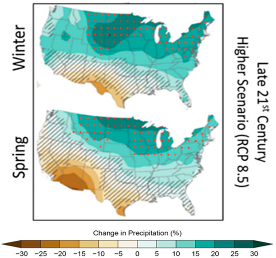 Figure 6. Projected precipitation changes over the continental U.S. by the end of the 21st century (high-emission case). Red dots (diagonal hash marks) indicate locations where projected changes are large (small) compared to historical variability. Adapted from the National Climate Assessment Report [91].