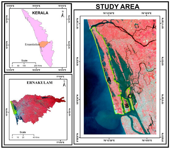 The study area (A) Vypin Island (B) Vallarpadam Island (C) Bolgatty Island.