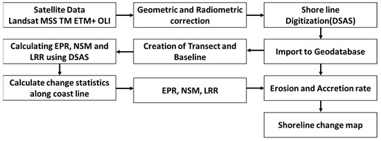 Shoreline delineation was done by adopting different methods, such as digital image processing, band masking, and on-screen digitization. The methodology is explained in the flow chart (Figure 2).