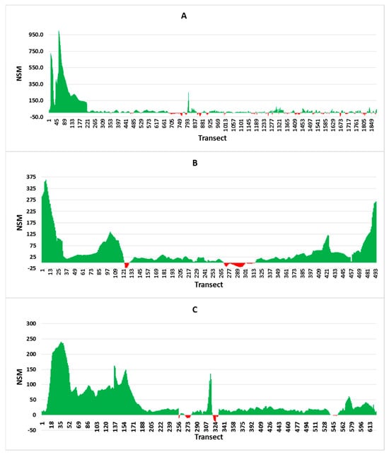 Graph showing the net shoreline movement (NSM) for three islands (A) Vypin, (B) Vallarpadam, (C) Bolgatty island.