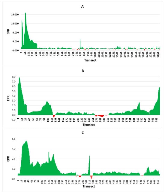 Graph showing the end point rate (EPR) for three islands (A) Vypin, (B) Vallarpadam, (C) Bolgatty island.