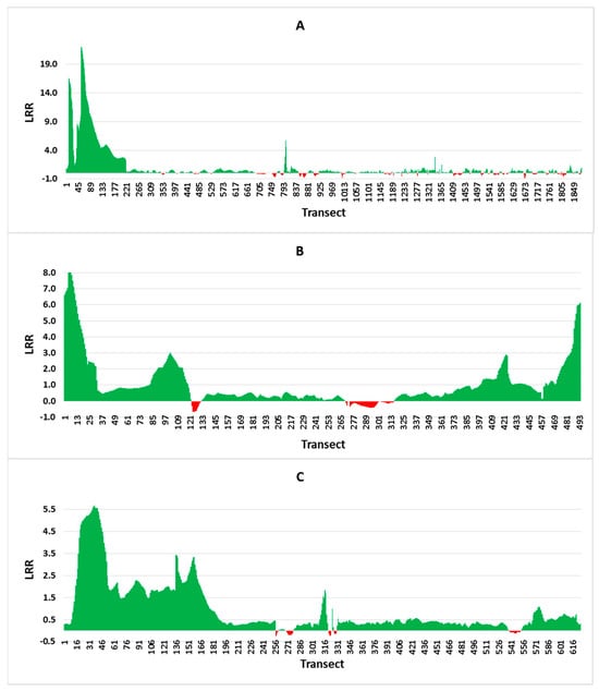 Table 1 provides a detailed overview of the linear regression frequency and the average levels of shoreline transition for the three islands. The LRR is calculated based on the least squares regression line fitting all shoreline points for a given transect. To calculate the sum of square residues, the regression line is fitted in the computation process, and the slope of the line indicates the linear regression rate [28]. Vypin mean LRR values indicated an LRR of 0.97, which was subjected to deposition during the study period. All the islands in the study area have positive values that indicate depositional activity. Figure 4 displays the graphical representation of three islands by LRR. These graphs show that Vypin Island’s maximum value is 22.13 and its minimum is −0.93. The maximum mean value of LRR found on the island of Vallarpadam is 1.03, and at least 0.95 on the island of Bolgatty. This is supported by high accretion rates on Vypin, Vallarpadam, and Bolgatty Island from 1973 to 2019 (Figure 8).
