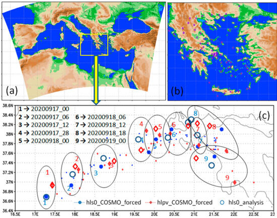 This observation was further checked by taking the PMSL analyses of both experiments for the nine dates and times in the upper left of Figure 1c. The resulting tracking points are also displayed in Figure 1c with the open legends. These points are in relative agreement with those of the 48 h hindcast displayed with closed legends. As expected, they coincide with those in the beginning of the hindcast, but they depart from the corresponding ones as the hindcast progresses. It is very interesting to note, however, that the last point (point 9) of the PMSL analysis without Aeolus data is in the relatively proper place of the Kyparissian Golf. Thus, it looks like the model synergies of the hindcast run without Aeolus spatially devaluate the PMSL track as the hindcast progresses. In order to better visualize the above analysis, the abovementioned tracking points are circled in groups of four with ellipses according to their corresponding times.