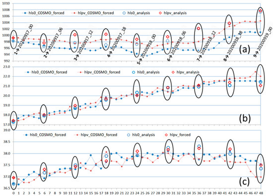 Medicane’s PMSL minima (hPa) (a) along with their corresponding geographical longitudes (°E) (b) and latitudes (°N) (c) over the 48 h hindcast period in reference to the COSMO model implementations without (red-hlpv) and with (blue-hls0) Aeolus-assimilated data. Open (closed) legends refer to model analyses (hindcast runs). The x-axis displays the hindcast time (hours). The legends regarding the 6 h intervals are grouped in black ovals in correspondence to Figure 1c.