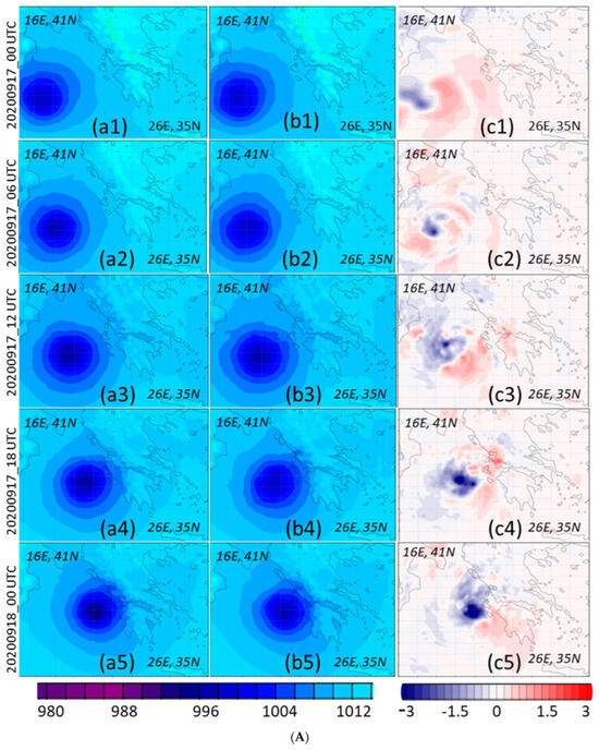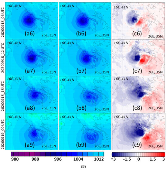 (A). PMSL (hPa) with (a1–a5) and without (b1–b5) Aeolus-assimilated COSMO hindcast runs along with their differences (“with Aeolus” minus “without Aeolus”) (c1–c5) from 20200917_00 UTC to 20200918_00 UTC of the 48 h hindcast period in reference to the geographical coordinates of the NW (16E, 41N) and SE (26E, 35N) corners of the target area. (B). PMSL (hPa) with (a6–a9) and without (b6–b9) Aeolus-assimilated COSMO hindcast runs along with their differences (“with Aeolus” minus “without Aeolus”) (c6–c9) from 20200918_06UCT to 20200919_00 of the 48 h hindcast period in reference to the geographical coordinates of the NW (16E, 41N) and SE (26E, 35N) corners of the target area.