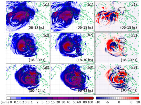 Twelve-hour accumulated precipitation (mm) with (a1–a3) and without (b1–b3) Aeolus-assimilated COSMO hindcast runs along with their differences (“with Aeolus” minus “without Aeolus”) (c1–c3) from the hindcast runs. The time periods are from: 2020091717_06 UTC to 20200917_18 UTC (6−18 h), 20200917_18 UTC to 20200918_06 UTC (18−30 h), and 20200918_06 UTC to 20200918_18 UTC (30−42 h).