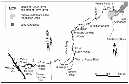 Plan view of Peace River and Peace–Athabasca Delta (showing only the northern portion of Athabasca River). From [13], with changes.