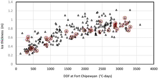 Cross-sectional average ice thickness near the WSC Peace Point gauge, plotted versus accumulated degree-days of frost at Fort Chipewyan starting on October 1 of the year preceding the breakup year (Fort Chipewyan is located on the north shore of Lake Athabasca, ~90 km SE of Peace Point). The red circles mark IJF years. Adapted from [28]. Data range: 1962–2020. Thickness data source: WSC archives for the Peace Point gauge.