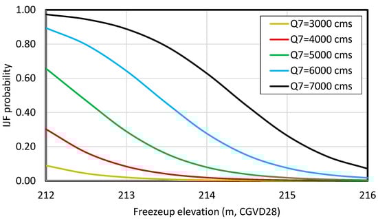To visualize how IJF probability varies as a function of breakup flow and freezeup level, the (Q7, HF) model in Table 1 is selected, and the indicated model coefficients are entered in Equations (1) and (2). The results are illustrated in Figure 5: for any given breakup flow, the probability P(IJF) decreases as HF increases; for any given HF, P(IJF) increases as Q7 increases.