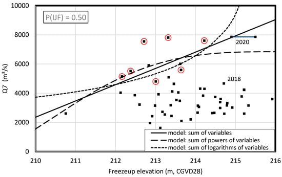 Isolines for P(IJF) = 0.50, as generated by the three models in Table 2. The data points represent observed annual values of Q7 and HF at Peace Point for the period from 1962 to 2020, excluding the reservoir-filling years 1968–1971; the red circles mark IJFs. For 2018, the flow may have been higher than shown; for 2020, the freezeup level is only known to be within a range of elevations.