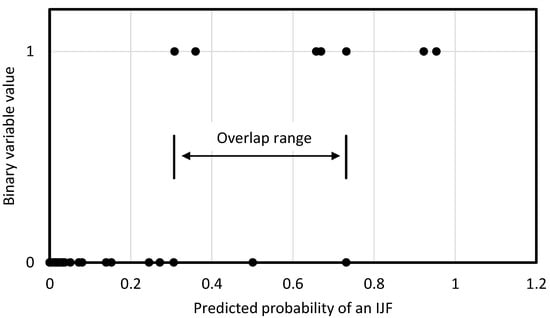 IJF occurrence (binary variable = 1) or non-occurrence (binary variable = 0) versus predicted probability using the regression model of [22]. Note the large overlap range that includes 5 IJFs and 6 non-floods.