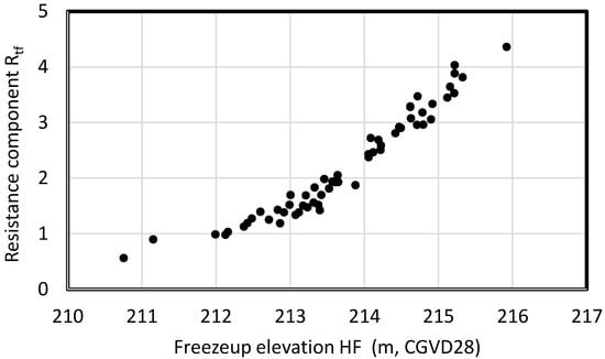 Apart from morphological and thermal factors, ice cover resistance to dislodgment is influenced by HF and hio. For the vicinity of the Peace Point gauge, the effects of these two variables are combined in a dimensionless quantity, Rtf, which can be closely approximated using the following expression [26]: