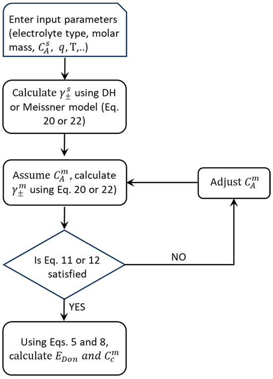 For a given aqueous phase with a known electrolyte concentration, is calculated using the selected liquid phase electrolyte model for the mean ionic activity coefficient, i.e., the DH and Meissner models. Together with the known charge density of the IEM (q) as an input parameter, Equation (11) or Equation (12) are solved iteratively for , and hence Equation (5) is used to solve for EDon. The concentration of the cation inside the membrane () is obtained directly from Equation (8). The flow chart for the numerical solution employed in this work and implemented using Excel spreadsheets (Microsoft® Excel® 2016) is shown in Figure 1.