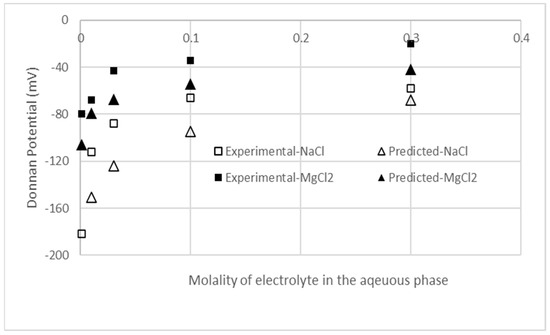 In this work, the Meissner model, a generalized corresponding state activity coefficient model that proved very reliable as a predictive model for treating highly concentrated solutions, is used to predict activity coefficients. Figure 2 compares the experimental measurements of Gokturk et al. [14] for both NaCl and MgCl2 with model predictions using the Meissner model. Reasonable agreement is observed, which verifies to some extent both the applicability of the experimental approach of Gokturk and the suitability of the Meissner model for handling highly concentrated electrolyte aqueous solutions. Model prediction for both electrolytes overestimates Donnan’s potential. In view of Equation (5), this is equivalent to saying that the Meissner model either underestimates the ionic activity inside the membrane relative to the actual value or overestimates the ionic activity in the external aqueous feed solution. However, the model was proven to give excellent predictions for aqueous phases of electrolytes up to and even exceeding a molality of six [21]. The predicted concentration of the ion inside the membrane is probably underestimated by the model, which leads to lower than actual ionic activity inside the membrane. It is also observed that the Donnan potential is lower for higher-valence counter-ions (e.g., Mg+2), leading to reduced co-ion exclusion, which is in agreement with Gokturk et al. [14].