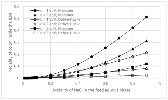 The effect of the IEM fixed charge density (q) on the generated Donnan potential, using the classical DH and Meissner models, is shown in Figure 4. The results in this figure reveal excellent agreement between the DH and Meissner models for electrolyte concentrations up to a molality of 0.1 (approximately 6000 ppm). Beyond this concentration, however, the DH model overestimates the predicted (absolute) Donnan potential relative to the Meissner model. The difference between the predictions of the two models grows with the electrolyte feed concentration. The overestimate of the predicted Donnan potential by the DH model is attributed to the basic assumptions inherent in the DH model. Also, at higher feed concentrations of the electrolyte, the mismatch between the two models grows with the level of the IEM fixed charge. For example, at an electrolyte concentration of 0.2 M (11,688 ppm), the DH model overestimates Donnan potential by approximately the same amount of 5 mV relative to the Meissner model for the three levels of fixed charge density investigated in this study, i.e., 1, 2, and 5 equivalent/L. However, the corresponding overestimates of Donnan potential for an electrolyte concentration of 5 M (292,200 ppm) are 13, 29, and 50 mV for the fixed charge densities of 1, 2, and 5 equivalent/L, respectively. This can result from a higher degree of deviation from ideal solution behavior (i.e., the equal activity coefficient of the ions inside the membrane and in the aqueous feed phase), an inherent assumption in the DH model. Figure 4 also reveals that a higher (absolute) Donnan potential is obtained by a higher IEM fixed charge. This is expected given the higher exclusions of co-ions at the high IEM fixed charge [12].