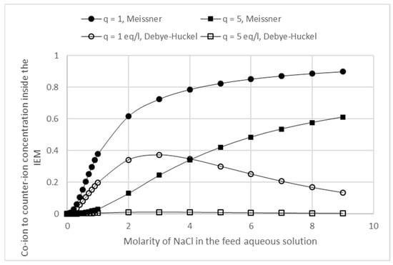 Predicted co-ion concentration inside the IEM at 298 K for three levels of the fixed charge.