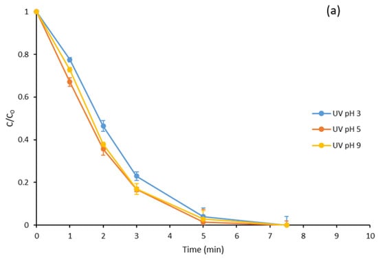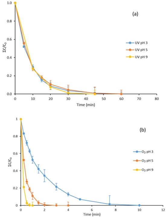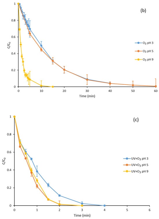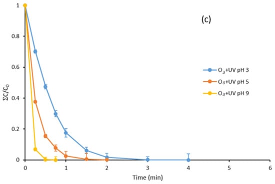 Normally, ozone exhibits a synergistic effect when combined with other agents capable of generating hydroxyl radicals, such as UVC radiation or the addition of oxidants like hydrogen peroxide or peroxymonosulfate [32]. For this reason, the degradation of this mixture of compounds at different pH values when subjected to simultaneous treatment with O3 and UV radiation at 254 nm was studied. The results obtained are shown in Figure 1c.