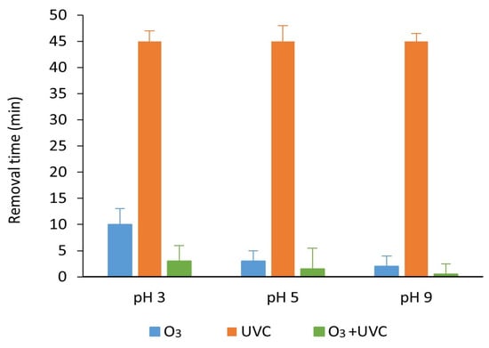 It can be observed that the synergistic effect of both treatments is evident under the most unfavorable pH conditions (acidic pH) where the degradation time was reduced from 10 min for the O3 treatment to just over 2 min in the combined O3/UV treatment. These results are considered logical since at acidic pH, the degradation of the contaminants occurs as the ozone directly attacks the paraben molecules since the production of hydroxyl radicals under these conditions is negligible. On the other hand, at basic pH, the indirect mechanism predominates due to the considerable amount of hydroxyl radicals present, so the addition of UVC radiation to the degradation process only slightly reduces the reaction time. This effect is best illustrated in Figure 2.