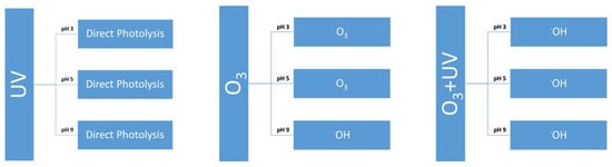 Schematic description of the main mechanisms or reactive species involved in the three processes applied (UV, O3 and O3 + UV) at the different pHs tested (3, 5 and 9).