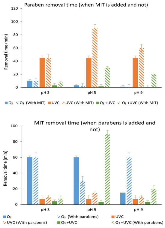 Comparison of paraben and MIT degradation by ozone, UVC light (254 nm), and O3/UV (254 nm) treatment at different pH values. Time necessary for the disappearance of the initial molecule. Initial concentration of each pollutant: [methylparaben] = 5 mg·L−1, [ethylparaben] = 5 mg·L−1, [propylparaben] = 5 mg·L−1, [butylparaben] = 5 mg·L−1, [benzylparaben] = 5 mg·L−1. O3 dose = 0.2 g/h. The graph above shows the degradation of parabens in the absence and presence of MIT. The lower graph shows the degradation of MIT in the absence and presence of parabens.