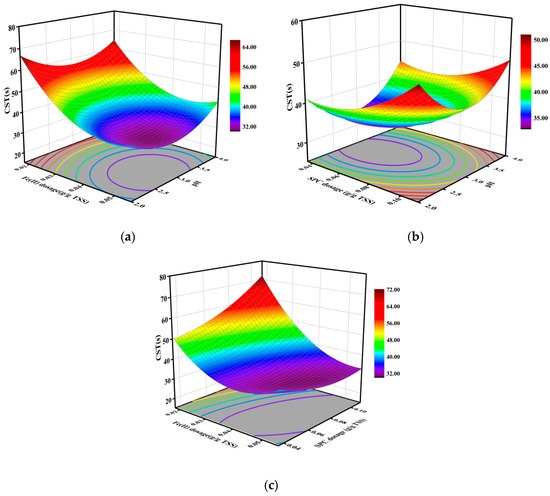 Response surface diagram for the interaction effect of (a) Fe(II) dosage and initial pH; (b) SPC dosage and initial pH for CST; (c) Fe(II) dosage and SPC dosage for CST.