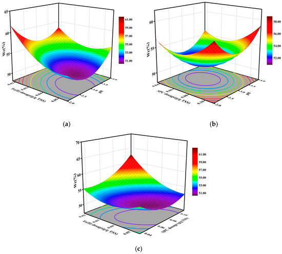 The 3D response surfaces of the Wc model in this study are presented in Figure 2. Figure 2a,b demonstrate the weak synergistic effects of Fe(II) dosage and initial pH as well as SPC dosage and initial pH. It should be noted that the pH range of 2 to 4 has a minimal impact on the Fenton process and the dissociation of Fe(II) and SPC. Previous studies have reported a wider range of interaction between initial pH and reagents. Moreover, an alkaline condition is unfavorable for the disintegration of SPC, resulting in a low release rate of H2O2 [25]. When the initial pH exceeds 4, the precipitation of Fe(III) hinders the Fe(III)/Fe(II) cycle and the formation of Fe(II) [26,27]. Notably, when the initial pH is set at 3, a minimal water content is achieved with an appropriate dosage of Fe(II) and SPC. Similar to the CST model, Figure 2c demonstrates a strong synergistic effect between Fe(II) dosage and SPC dosage for Wc. Deviating from the optimal dosage of Fe(II) or SPC, whether in excess or in low doses, leads to a decrease in the solids content of the sludge cake. Therefore, from a statistical perspective, proper control of the proportion of these two reagents can further enhance dewatering effects and reduce reagent dosage.