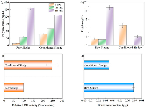 The properties of sludge before and after conditioning: (a) polysaccharides and (b) protein in EPS layers; (c) relative LDH release of the conditioned sludge (raw sludge as the control); (d) bound water content.