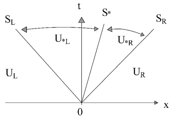 Figure 1 shows the structure of the waves in a control volume for the solution of the Riemann problem. It is attached to the model in addition to wave velocities and mid-wave velocities to modify the structure of the solution. Considering the form and evaluation of the integral form of the law of conservation, we obtain the desired control volume for the Riemann equations.