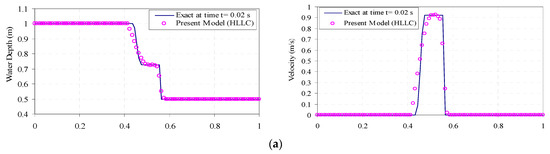 To evaluate the proposed numerical model, first, 1D dam-break problem in a wet bed is considered. The initial conditions in this test include: flow depths at upstream and downstream are 1.0 m and 0.5 m, respectively; initial flow velocity is zero; and the length of the model is 1.0 m. In numerical modelling, the flow length is divided into distances of Δx = 0.01 m. The value of 0.9 is assigned to the CFL number coefficient. In Figure 2, the numerical results in different times are compared to the Stoker analytical solution. Note that the dam is located at x = 0.5 m.