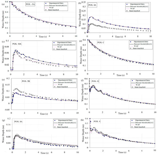 Comparison of the water level profile between the developed numerical model and the laboratory test or the other numerical models in 2D symmetrical partial dam-break laboratory test at points (a) −5A, (b) 4A, (c) 10A, (d) C, (e) 5B, (f) O, (g) 8A, and (h) 4.