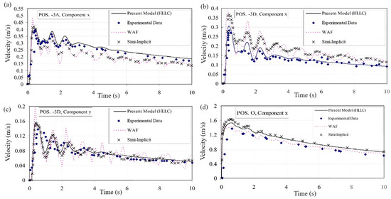 Comparison of the present numerical model with the laboratory test and the other numerical models in the symmetrical partial dam-break for flow velocity component (a) u at point −3A, (b) u at point −3D, (c) v at point −3D, and (d) u at point O.