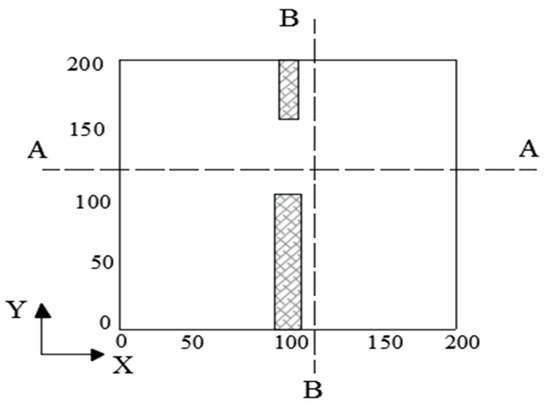 The next experimental dam-break case was performed by Alcrudo and Garcia-Navarro [46] and the simulated data were obtained from [38]. The computational area was a 200 m × 200 m area with closed boundary conditions and a bed slope of zero with an asymmetric gap of 75 m; width at x = 100 m (Figure 7).