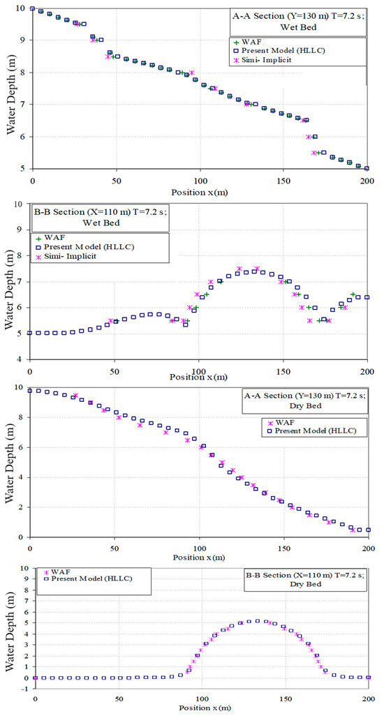 Figure 8 illustrates a 3D view of the conducted test at 7.2 s. To evaluate the developed 2D model, two longitudinal and transversal cross-sections at x = 110 m and y = 130 m were quantitively considered (Figure 7), and the water level data were compared to those of the other numerical methods and the experimental data. Figure 9 illustrates the comparison results for the two cases of dry and wet bed in t = 7.2 s. In addition, Table 5 presents the dimensionless error parameters for quantitative evaluation of the method’s performance.